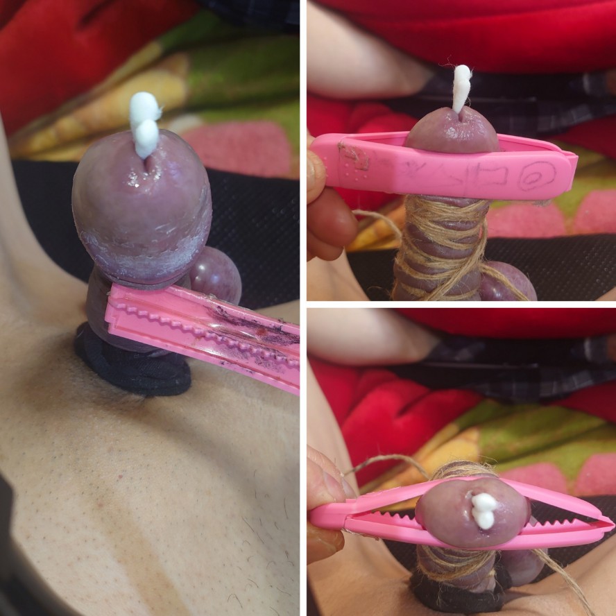 亀頭をギザギザクリップで挟み潰し